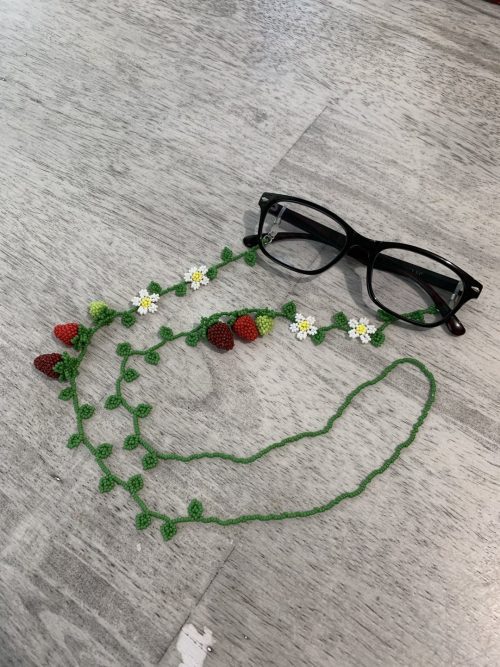 Sweeten your accessory game with this adorable beaded vine featuring tiny strawberries and white blossoms. You can do this to add a fruity pop to your frames.
