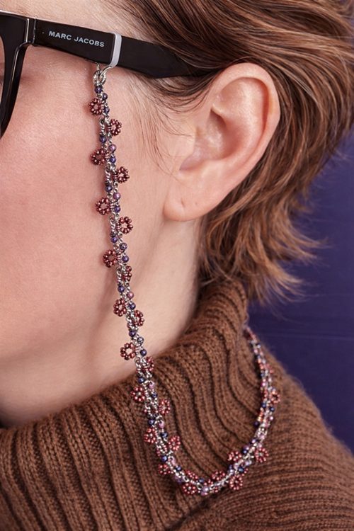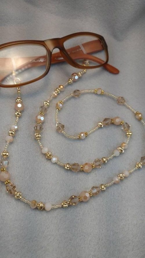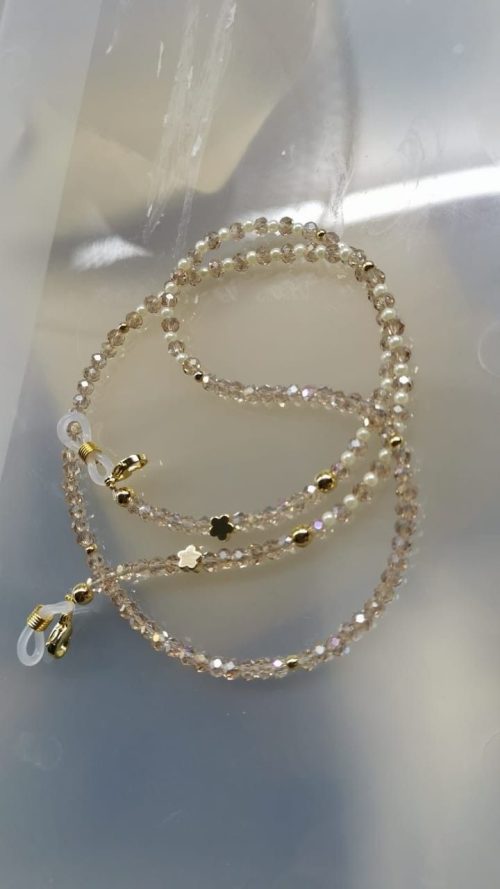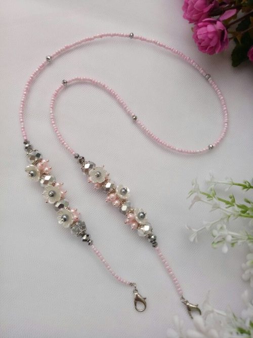 Here is a chain with soft pink beads and dainty white flowers. It is a project that adds a perfect feminine touch to your eyewear.