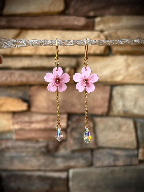 Another example of a Japanese sakura-style pair of earrings. Hanging on a gold-toned chain, the crystal drop on the end gives it that finesse!