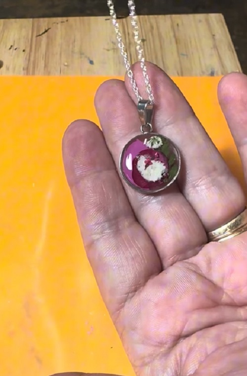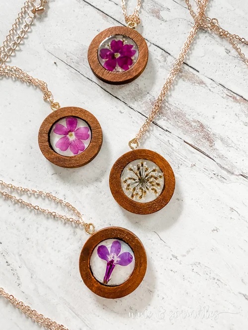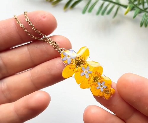 Use a deep-well UV resin mold to layer flowers and even small leaves or glitter before curing. It will give your necklace depth and dimension like a tiny terrarium. Here is more.