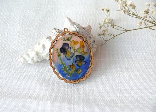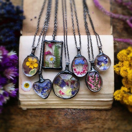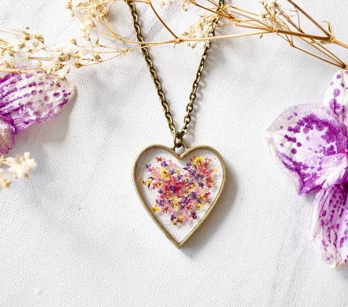 Get romantic with a heart-shaped pressed flower necklace, using colorful blooms. You can encase it in clear resin and set it in a metal bronze or gold frame. Here is more.