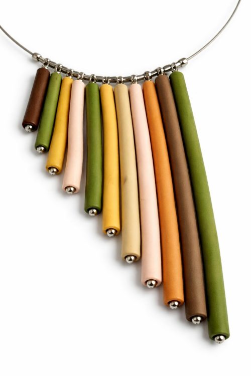 This tube necklace is crafted from polymer clay in muted earth shades, creating a soft rainbow effect that’s modern yet grounded. Here is the Idea to follow.