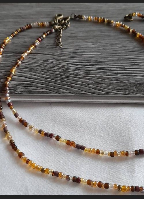 Use tiny seed beads in tan, brown, and olive tones, and thread them in a looping pattern over soft cord. This lightweight design is perfect for everyday wear and layering.