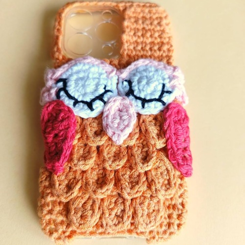 Let us try this calming crocheted design featuring a drowsy owl face and soft, pointed ears. The neutral tones give your device a relaxed feel.