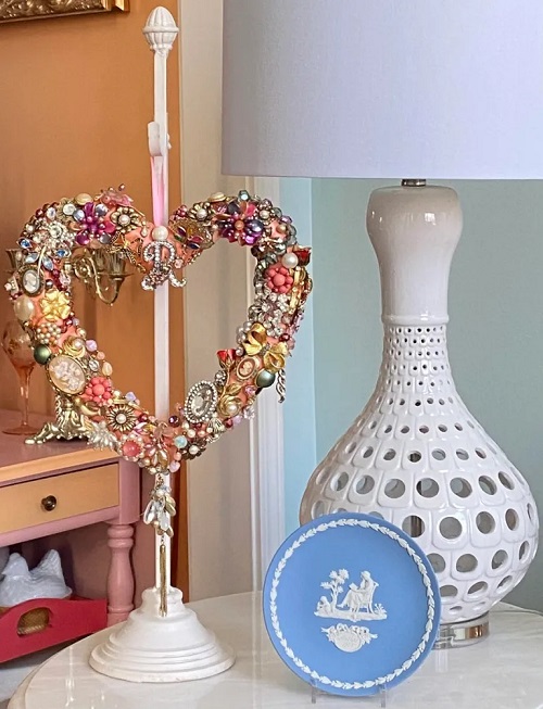Elevate your vanity by hanging a jewel-encrusted heart wreath on a sleek pedestal stand.