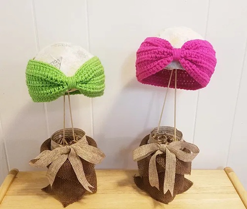 Here, the bright turbans with ribbed texture give it a soft, full look, making it great for winter accessories.