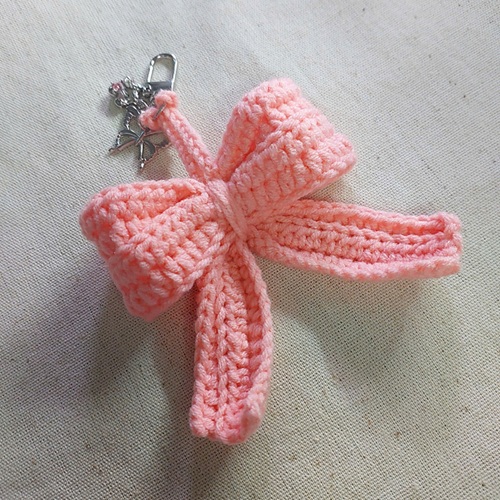 This soft crochet bow with long tails has a lovely, elegant shape. It works beautifully as a keychain charm or bag accessory.