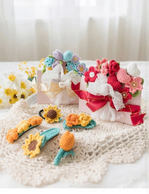 Why go for a single pattern when you can make an entire set that has hair clips, hair bands, and a brooch, all in three different colors?