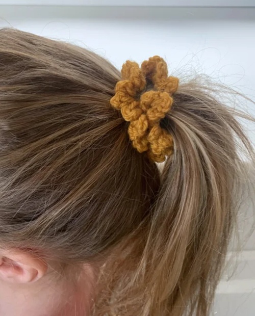 A very beautiful floral crochet hair accessory, make this scrunchie and tie your ponytails and head buns, with style!