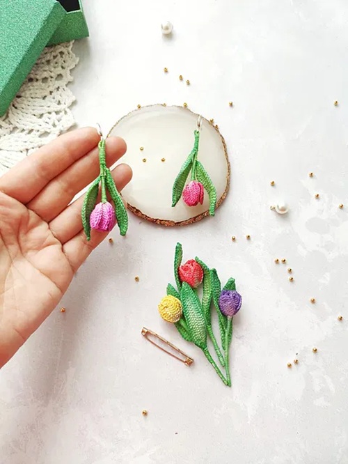 Enjoy crafting these soft tulips with thread and simple tools readily available. Here is more about shaping petals and other parts with embroidery-style wrapping.