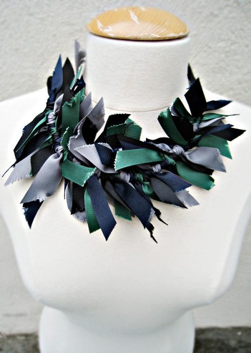 Use ribbons of different widths and colors, and knot them in an abstract pattern down the center to create a textile statement necklace that’s soft but boldly artistic. Here is more!