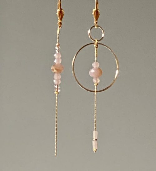 Imagine crystal beads forming asymmetrical dangles, with one earring having a tiny cluster and the other with spaced-out stones. Here’s the idea!