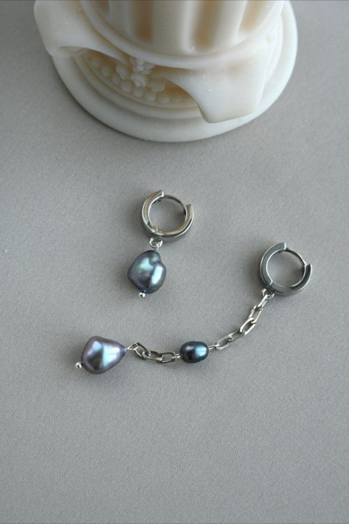 This idea pairs a sleek silver hoop with a long dangling chain and a pearl on one side, while keeping the other side minimal. It is perfect for creating a high-low effect.