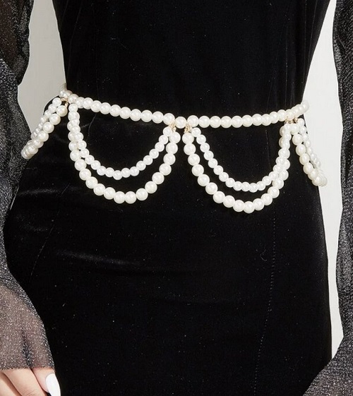 This one gives your waist an asymmetrical glow with four tiers of pearls that drape elegantly across one hip.