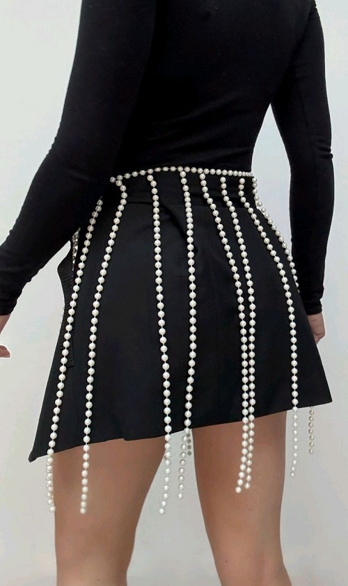 Turn your favorite mini skirt into a showstopper by adding long, vertical strands of pearls that move with you.