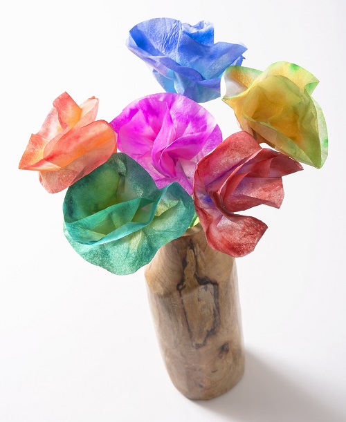 Turn simple coffee filters into beautiful paper flowers. Kids will love coloring and shaping them into pretty bouquets for decoration or gifts.