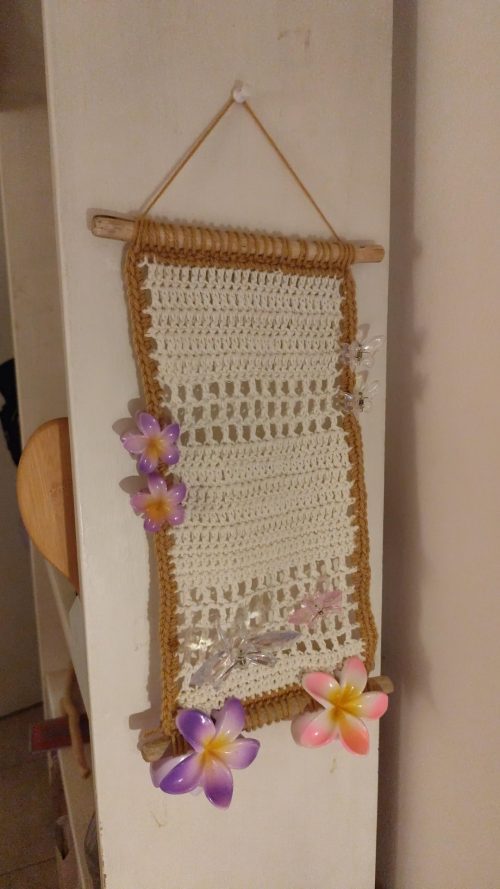 Hang this elegant cream and tan wall hanging to turn your clips into a decorative floral masterpiece. You can master this Crochet Claw Clip Organizer style here.