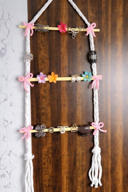 You can try this unique rope-style ladder for a minimalist look that showcases your favorite flower clips and sparkly bows.