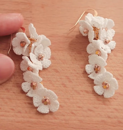 You can mimic a flowering vine! This idea shows how long earrings can be created, featuring a series of small, pure white blossoms.