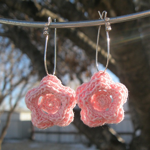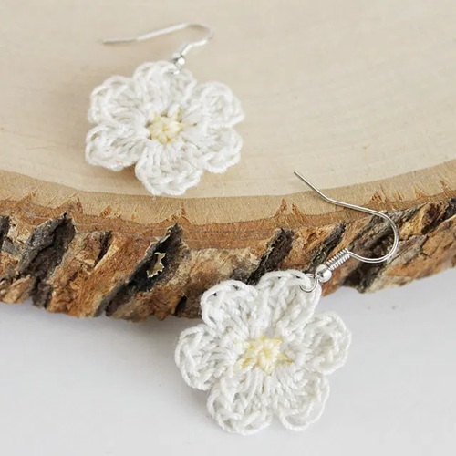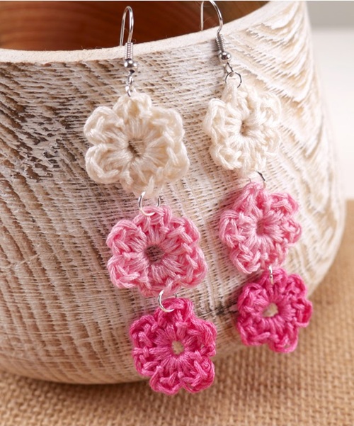 Try this idea where earrings use a pink and white yarn to create a textured, “open-stitch” floral pattern. The airy design gives them a lace-like appearance.