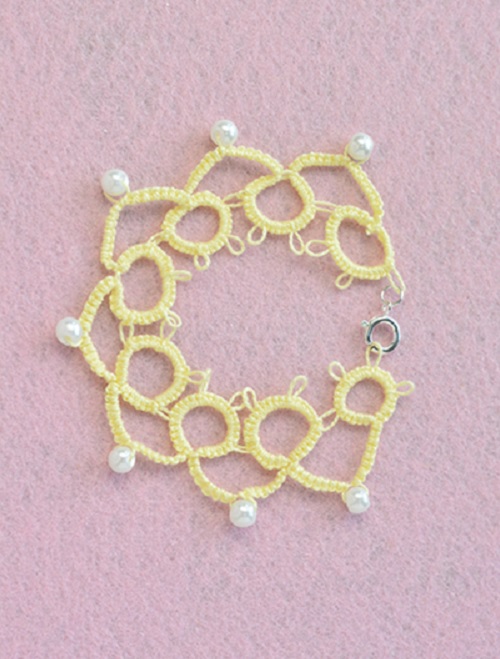 This pale yellow lace-style bracelet uses open loops and pearl accents for a vintage, airy feel. Here is the tutorial if you want to try a more delicate approach to your yarn work.