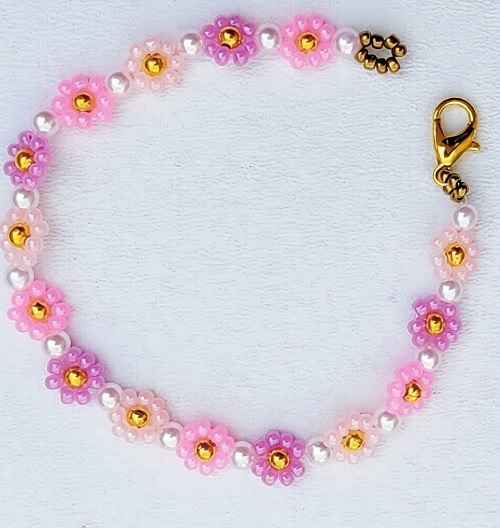 Soft pink tones and gold-centered flowers make this beaded piece a go-to for a dainty look. You’ll find the link here to start stringing these together.