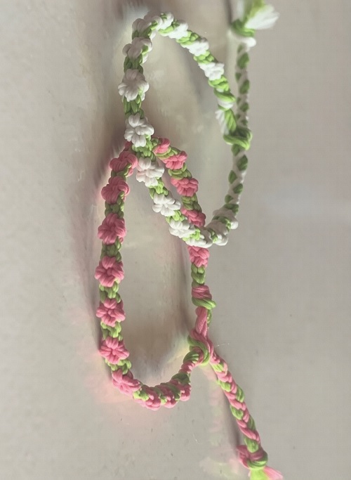 If you enjoy intricate knotting, these tiny pink and white buds woven into a slim cord are your next challenge. Check out the tutorial to learn the specific braiding technique.