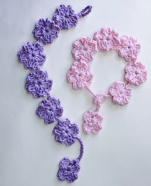 You can go for a monochromatic vibe with these linked purple and soft pink crochet flowers that sit flat against the skin. Follow the tutorial to connect each bloom.