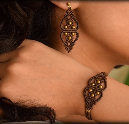 A catchy tutorial for making matching macramé earrings and a bracelet, complete with bead embellishments.