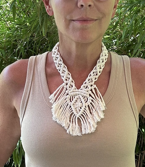 Let’s craft a macrame necklace using diamond knot patterns with this inspiration. Plus, it offers three different looks (with fringes, beads, shells).