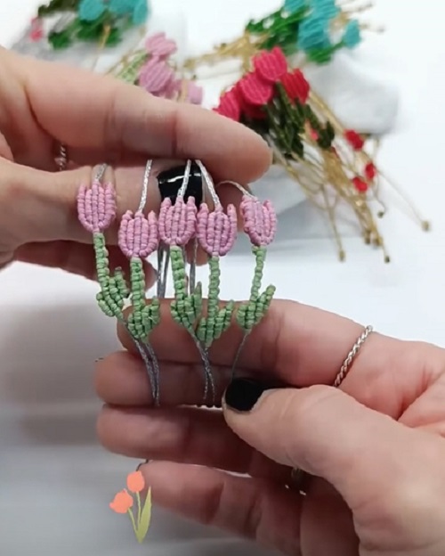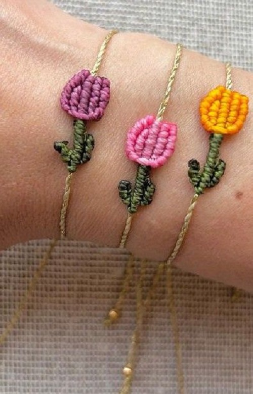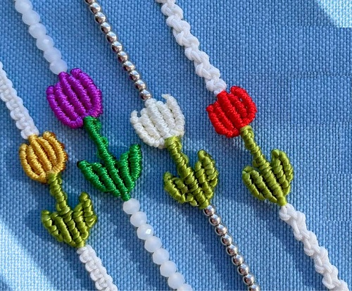 Let’s make something adjustable and gift-friendly with tiny tulip charms. This idea creates flexible sizing with neat macrame closures, making it suit everyone.