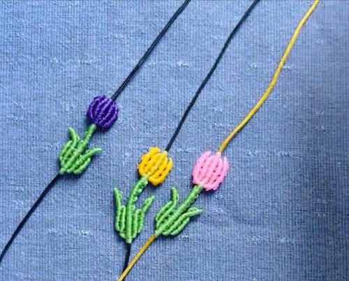 You can play with colors using this straight-line tulip pattern that are eyecatching. Here’s the tutorial showing how different cord shades bring playful charm to each flower.