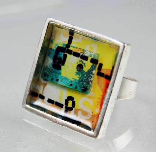 Use a photo paper or patterned image and set it into a ring tray so that you can top it with clear epoxy to create a mini “picture under glass” ring. Here is more!