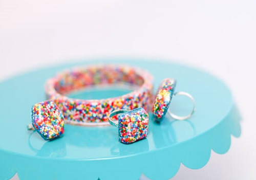 Embed real sprinkles in a resin ring to have a pop of color in your hands. Such rings are a fun addition during parties. Check the illustrated tutorial right here.