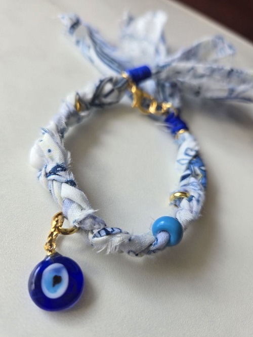 Keep the bad vibes away while looking fabulous with this cool blue braided bandana bracelet.