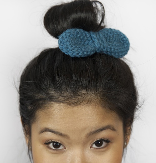 You can wrap your top-knot in style with this cozy, chunky teal bow. Check out how to make your messy bun look effortlessly chic.