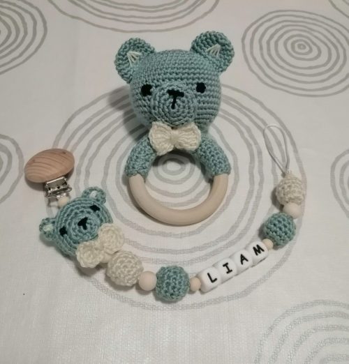 You can create a matching set with a teething ring and a personalized clip featuring a dapper bowtie. Making this coordinated duo is so satisfying.