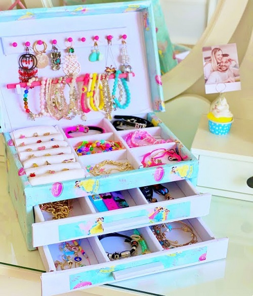 Why not just go ahead with this fun shoebox jewelry organizer that you can make from waste shoeboxes lying around in your house? Fun, right?
