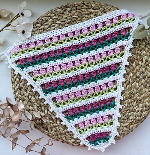 You can keep your hair in check with this stunning triangular bandana layered with rows of vibrant tulips.