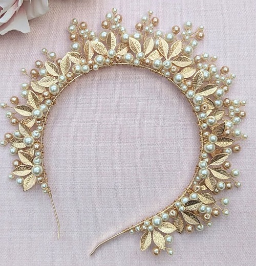 You can achieve a timeless Grecian look by combining metallic gold leaves with clusters of lustrous ivory pearls. Here is more!