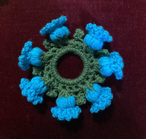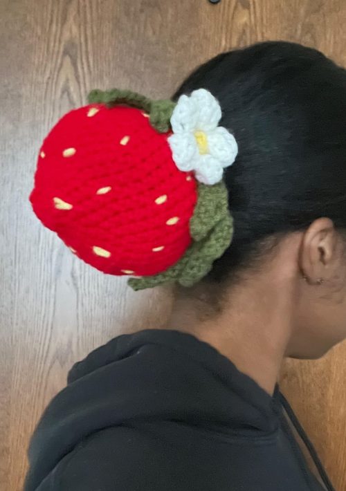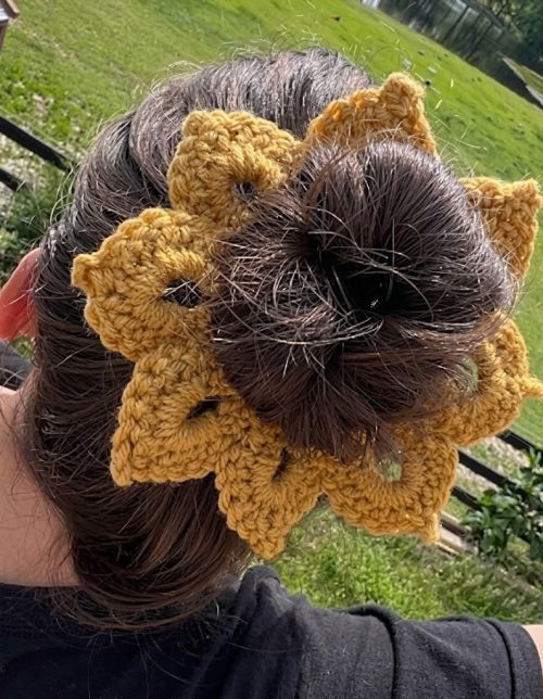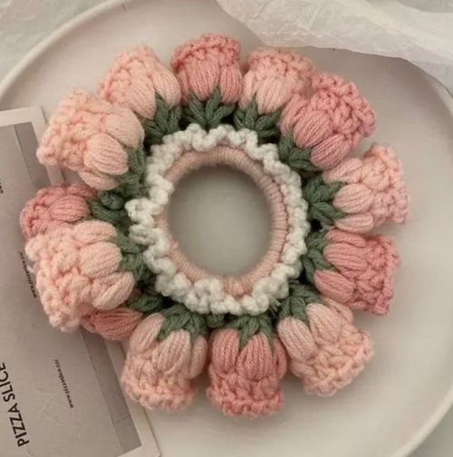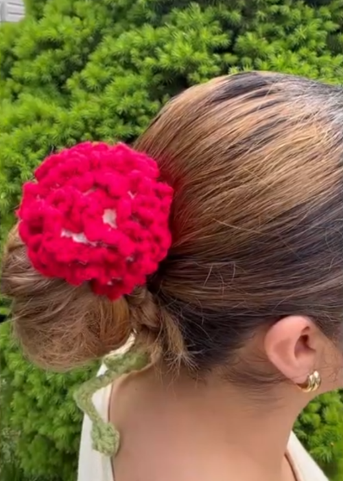 This brown scrunchie gives a soft floral vibe to your bun. It’s comfortable to wear and best suited for a beginner-friendly pattern.