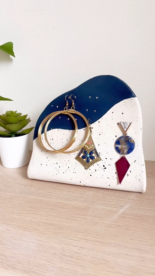 Organize your favorite earrings stylishly! This clay earring holder is simple to make and can be shaped into cute stands or dishes with holes for hanging jewelry.
