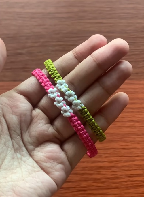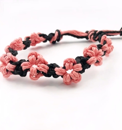 This charming bracelet uses knotting to create daisy flower patterns. A sweet and cheerful accessory that’s perfect for gifting.