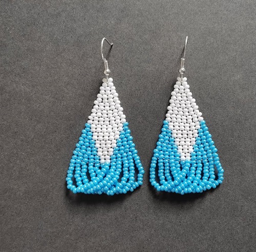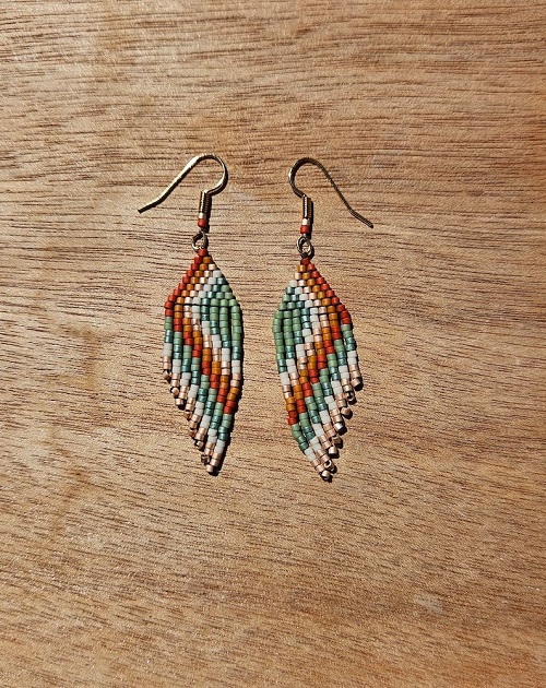 Modern seed bead drops with neutral and contrasting earthy tones give a trendy, textured look. These are lightweight and customizable in color patterns. Here is more!
