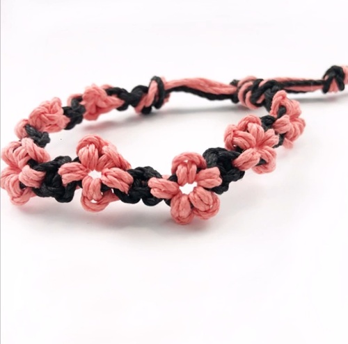 Beautiful floral shapes, such as daisies and are knotted in hemp bands or cords. You may add beads to enhance the look!