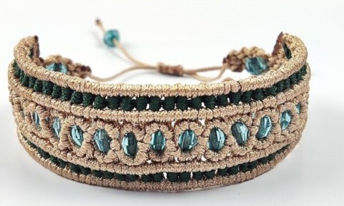 This one is not exactly a beaded macrame bracelet, yet a band made out of macrame, and the use of some bright colors in a black background gives the look of beads!