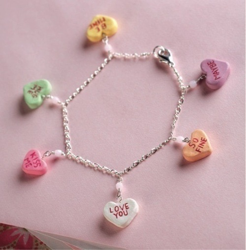 Relive the nostalgia of candy hearts by stamping sweet messages into colorful, heart-shaped clay charms. You can link them to a silver chain for a playful bracelet.
