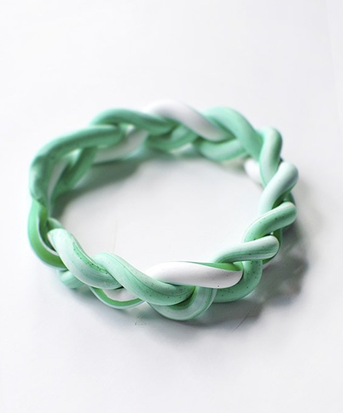 A simple clay coil can be turned into something unique by twisting refreshing mint and white strands into a chunky braided bracelet.