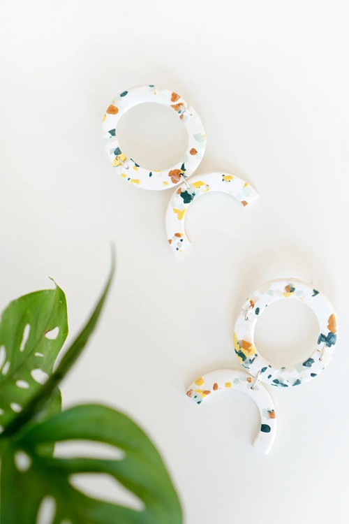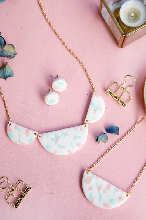 Try your hand at this playful terrazzo pattern to create a matching necklace and stud earring collection. If you mix soft pastels with white clay, you’ll achieve a trending piece!