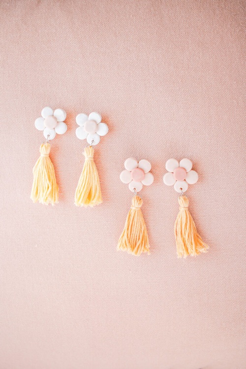 If you love a retro vibe, combine simple white clay flowers with sunshine-yellow yarn tassels. You can make these high-contrast earrings the centerpiece of your summer wardrobe.